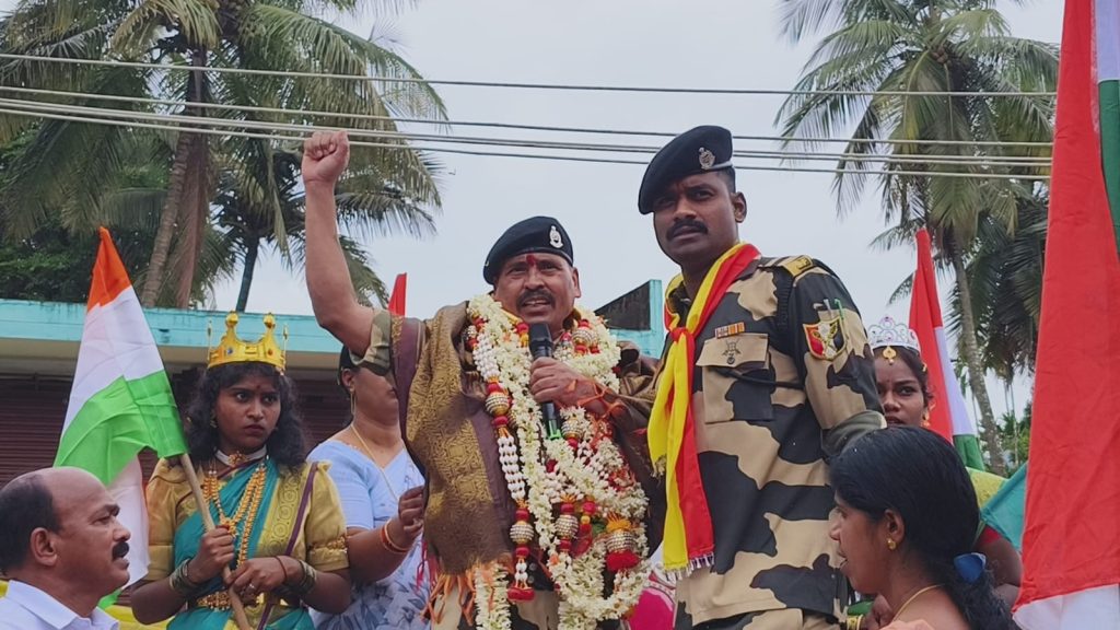 ಕಳಸ:ಪೆಹಲ್ಗಾಮ್ನಲ್ಲಿ ಪ್ರವಾಸಿಗರ ಹತ್ಯೆಗೆ ಪ್ರತೀಕಾರವಾಗಿ ಕಳೆದ ತಿಂಗಳು ಕಾಶ್ಮೀರದಲ್ಲಿ ನಡೆದ ಆಪರೇಶನ್ ಸಿಂಧೂರದಲ್ಲಿ ಭಾಗವಹಿಸಿದ್ದ ಕಳಸ ಮೂಲದ ಯೋಧ ಬಿ.ಡಿ.ರಾಜಪ್ಪ ಅವರನ್ನು ಪಟ್ಟಣದಲ್ಲಿ ಬುಧವಾರ ಹೃದಯಸ್ಪರ್ಶಿಯಾಗಿ ಸನ್ಮಾನಿಸಲಾಯಿತು.